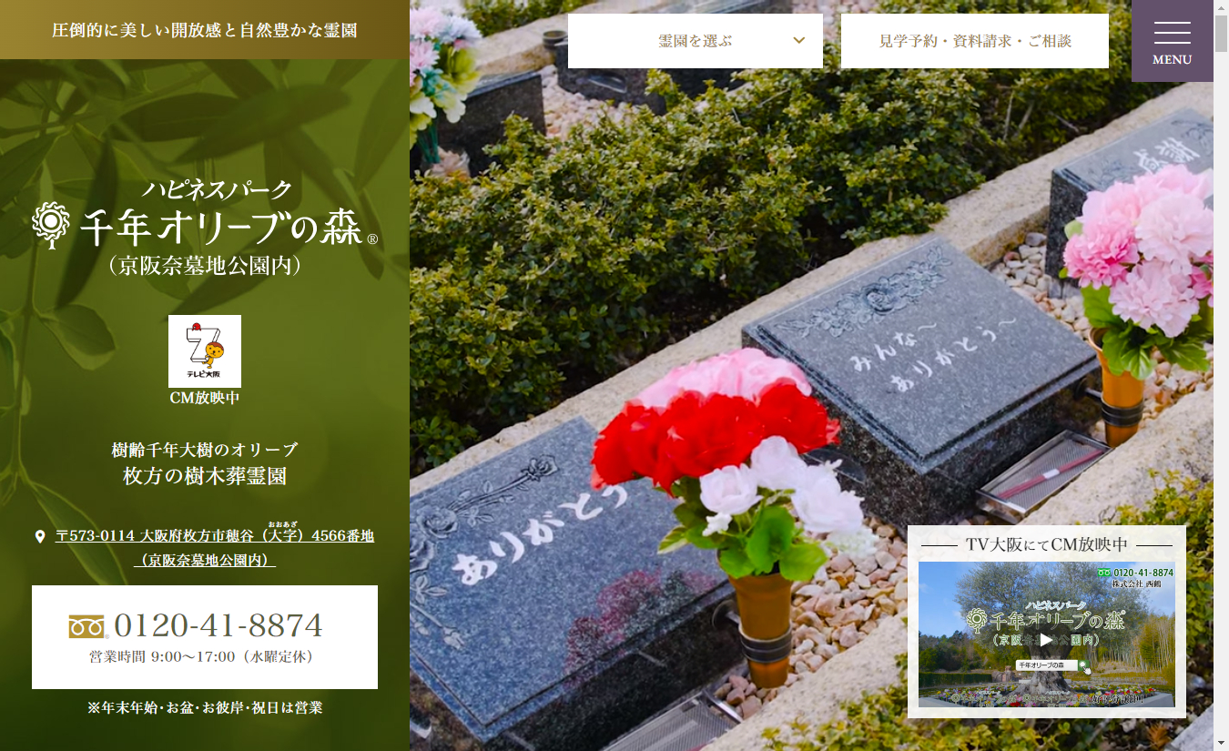 株式会社 西鶴は大阪府枚方市、交野市、和泉市、大分県大分市に、ハピネスパークを2霊園、千年オリーブの森を4霊園運営しています。