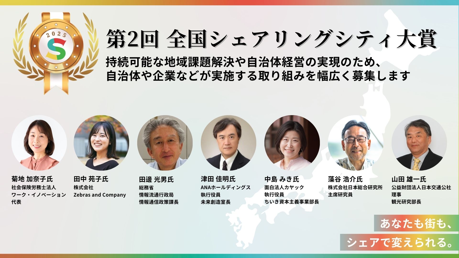 「全国シェアリングシティ大賞」は、一般社団法人シェアリングエコノミー協会(代表理事:上田 祐司氏[株式会社ガイアックス 代表執行役社長]、石山 アンジュ氏)が、シェアサービス事業者と自治体が連携した公民連携の取り組み事例を全国から募集し、表彰するものです。