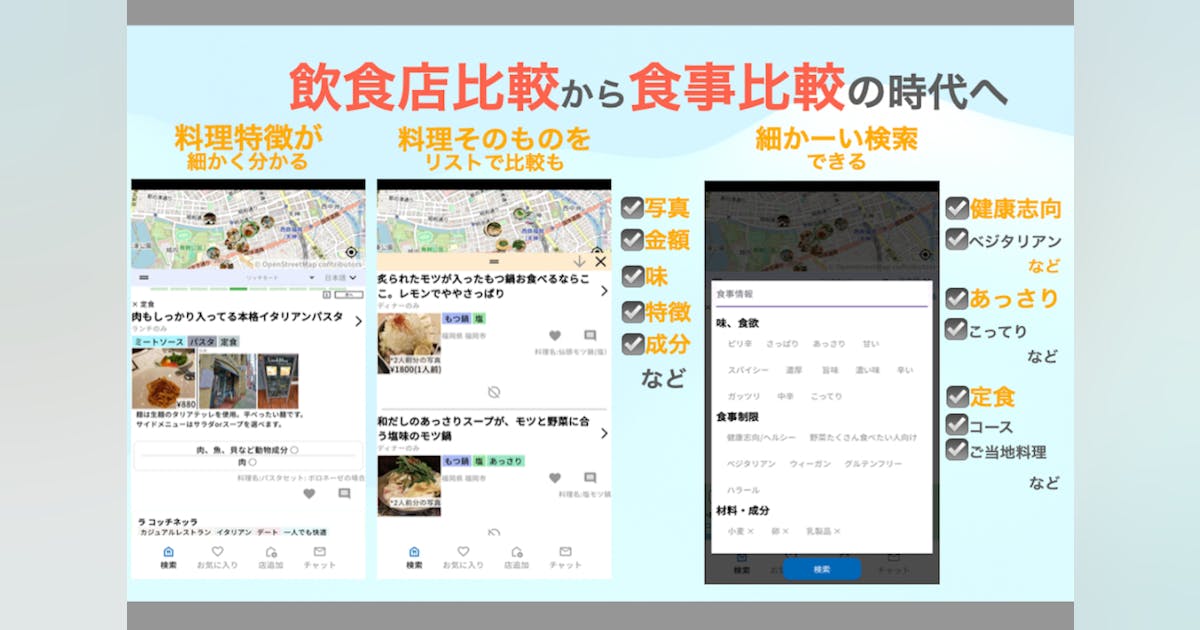 食事できる場所を探す際、“店”という大きな枠での比較では「特定の何か」を食べたい人にとって、提供される食事が不透明で物足りません。