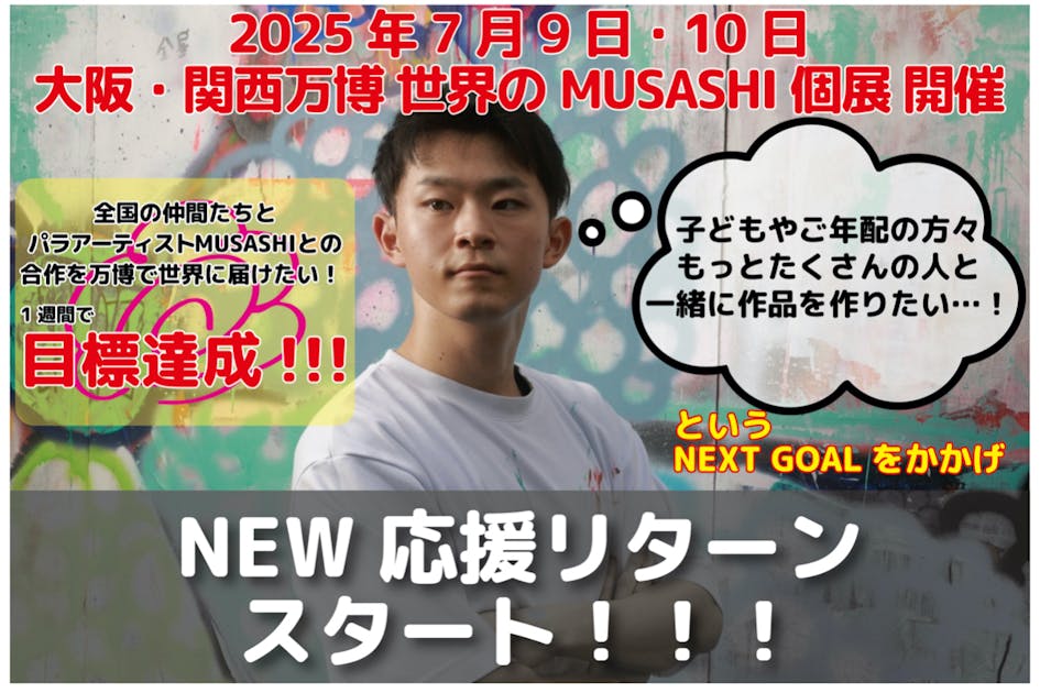 プロジェクトの目的は、7月9日(水)・10日(木)の2日間に万博で開催される『世界のMUSASHI個展』で展示予定のメイン作品の一つとなる、47都道府県の障がい福祉事業所とコラボして制作する合同作品の制作から展示までの費用を集めることと、実際に協力してくれる事業所を全国から募ること。