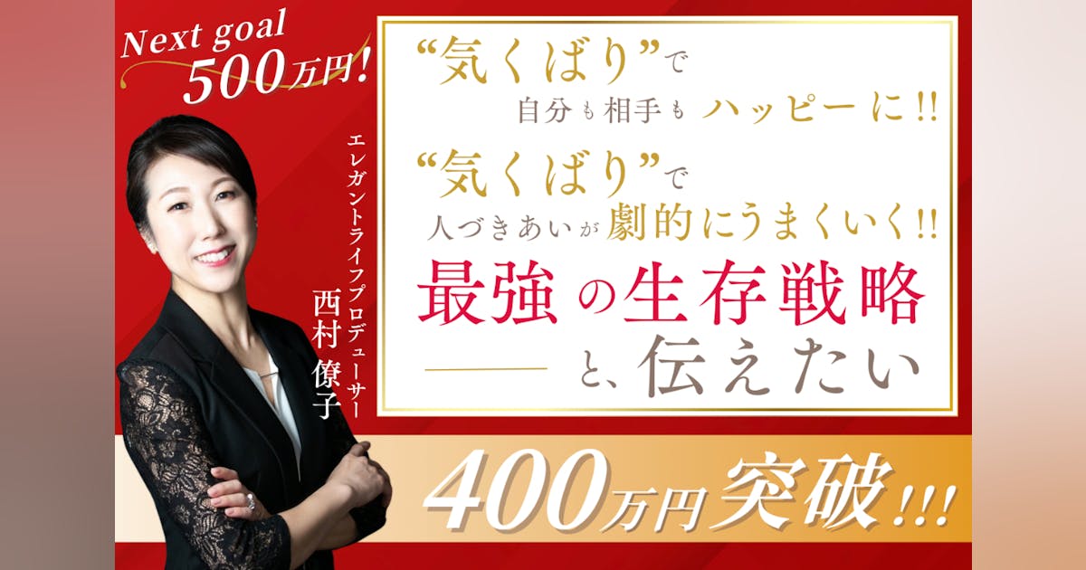コミュニケーション講座や女性のための『エレガント・グローバル・アカデミー』を開催している株式会社MOMO Style(所在地:神戸市、代表取締役:西村 僚子)は、2024年10月28日に出版した『「気くばり」こそ最強の生存戦略である』(SBクリエイティブ)の販促プロジェクトが目標金額222%を達成しました。本プロジェクトは500万円をネクストゴールに設定し、クラウドファンディングサイト「CAMPFIRE」にて2024年12月8日(日)まで行っております。