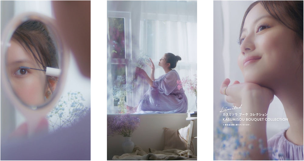 今回のキービジュアルでは、2025年春のメイクアップテーマである “KASUMISOU BOUQUET COLLECTION”をイメージした春の訪れを感じさせる優しく包みこむような空間の中で、儚くも可憐な美しさを引き出すメイクアップを施した。あどけない印象を与えつつも、大人の魅力も感じる今田の表情は、新ビジュアルの儚く美しいイメージをさらに盛り立てています。