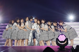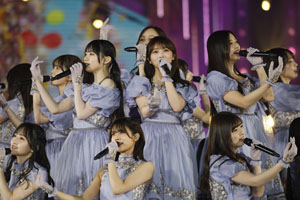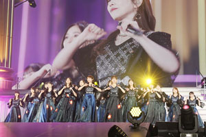 その後「今喋りきれなかった愛を精一杯込めて歌います」と告げるも、間違えて前日のアンコール1曲目に披露した『誰かの肩』をアナウンスしてしまい、会場が笑いにつつまれる。どこまでも与田らしいマイペースぶりに客席を優しい空気で充満すると、気を取り直して前夜にサプライズで配信された与田のソロ曲『100日目』を、最初で最後となるライブ歌唱をしてみせる。彼女らしさが凝縮されたこの曲をしっとり歌い切ると、会場は温かな拍手で包まれる。そして『他人のそら似』や『左胸の勇気』を歌いながら、与田はフロートに乗って観客に別れの挨拶をして回る。さらに、ステージ上にメンバーが勢揃いした『ジコチューで行こう!』では、間奏の“だるまさんが転んだ”で井上が与田の頬にキスする一幕もあり、ドーム内の熱気は最高潮に到達した。