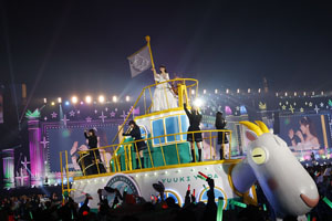 映像のエンディングで『逃げ水』のMV冒頭パートが映し出されると、それとリンクするように旅行カバンを手にした与田がサブステージに登場し、客席からは温かな拍手が送られる。そのままメンバーが待つメインステージまでゆっくりと歩き、全員と合流したところでカバンをテーブルに置き開いてみせる。すると、カバンの中からたくさんの思い出が溢れ出す演出とともに、ライブは彼女の初センター曲『逃げ水』からスタート。ドラマチックな曲調とともに客席の熱量が上昇していくと、以降も『ひと夏の長さより…』や『ロマンスのスタート』『あらかじめ語られるロマンス』『全部 夢のまま』と緩急に富んだ選曲や、ヤギを模した大型トロッコやフロートを用いた演出で観る者を大いに楽しませていく。