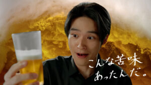 続いて、広⼤な⼤⾃然の中で育まれる⼤⻨や、爽やかな⾹りと苦味をもたらすホップからビールが出来上がるまでの過程を、圧倒的なスケール感で描写。そして再びシーンが切り替わり、新しい爽快な苦味、その先のうまさに出会い、覚醒した瞬間の表情を⽬元だけで印象強く描いている。最後は、「うまさが輝く、苦味がある。」というナレーションとともに『アサヒザ・ビタリスト』が紹介され、新たな時代の幕開けを予感させる、真⽥の⼒強いワンシーンで締めくくられる。