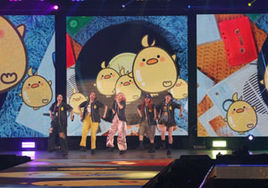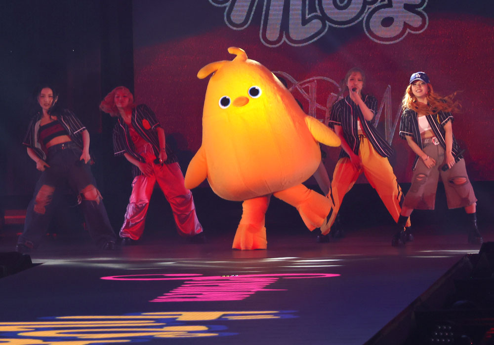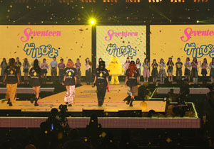 すると「JUMP」の終盤で紙吹雪が吹き、Seventeenモデル達とゲルぴよが登場。天井からは黄色い風船と紙吹雪の演出と、黄色いレーザーが入り乱れゲルぴよカラーに包まれる会場。メンバーのダンスパフォーマンスとSeventeenモデルたちのウォーキングとゲルぴよのキュートさが織りなす圧巻のコラボステージ。