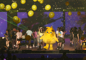 ゲルぴよとは、αGELの衝撃吸収力により割れずに助かったたまごから生まれた不思議で可愛いキャラクター。「プニプニの食感がたまらなくて、癒し効果も抜群。いまゲルキャラ界でも注目のキャラクター」と説明。そして、「ラストは皆さんと一緒に歌って、ジャンプして思いっきり盛り上がって行きましょう!」と2曲目の『JUMP』を披露。サビでの「JUMP」の「J」を表現した振付と「JUMP!JUMP!」の掛け声では、観客も体を揺らす。
