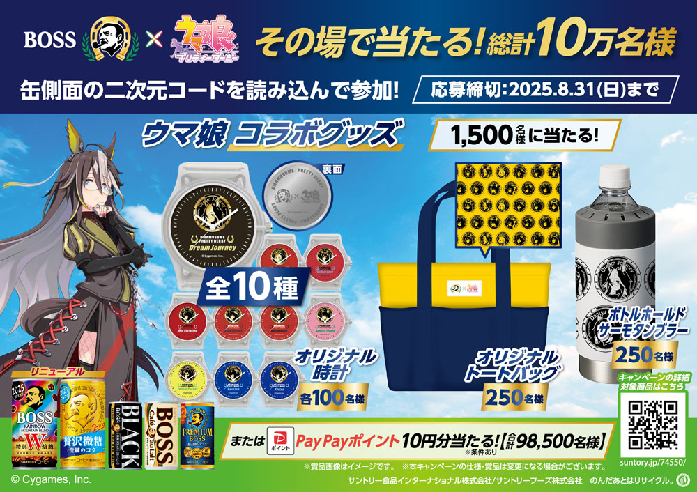 「BOSS」対象商品の二次元コードから応募できる、「ウマ娘 プリティーダービー」とコラボした「オリジナル時計」「オリジナルトートバッグ」「ボトルホールドサーモタンブラー」や「PayPayポイント」などの賞品が当たるキャンペーンを実施します。