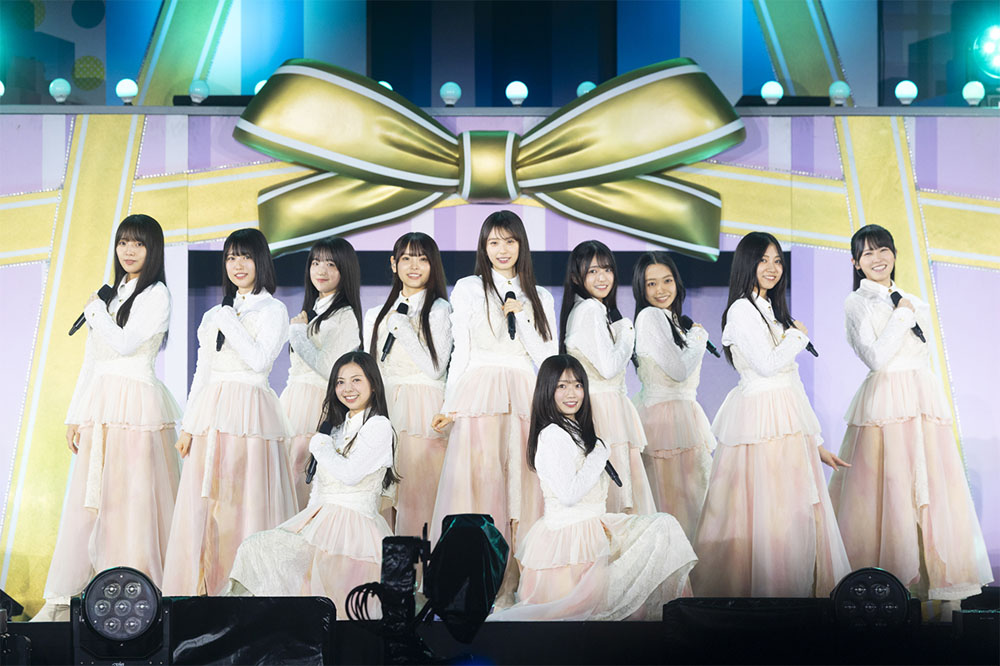 ライブもいよいよ後半戦に突入すると、ステージ上にはついに6期生が登場。DAY1こそ緊張を隠せない様子だった11人だが、この日は笑顔を浮かべて観客の声援に応える。そして、矢田萌華をセンターに据えた『タイムリミット片想い』が始まると、会場のボルテージは急上昇。続いて5期生が『バンドエイド剥がすような別れ方』、4期生が『ジャンピングジョーカーフラッシュ』で、会場の熱量をさらに引き上げると、3期生が『三番目の風』でその熱気をさらにヒートアップさせる。そして、『設定温度』で3期生から6期生までのこの日のライブ参加メンバー39名がついに勢揃い。1期生が結成当初から紡いできた歴史をしっかりつないでいることが伝わる、感動的な歌とパフォーマンスでオーディエンスを歓喜させた。