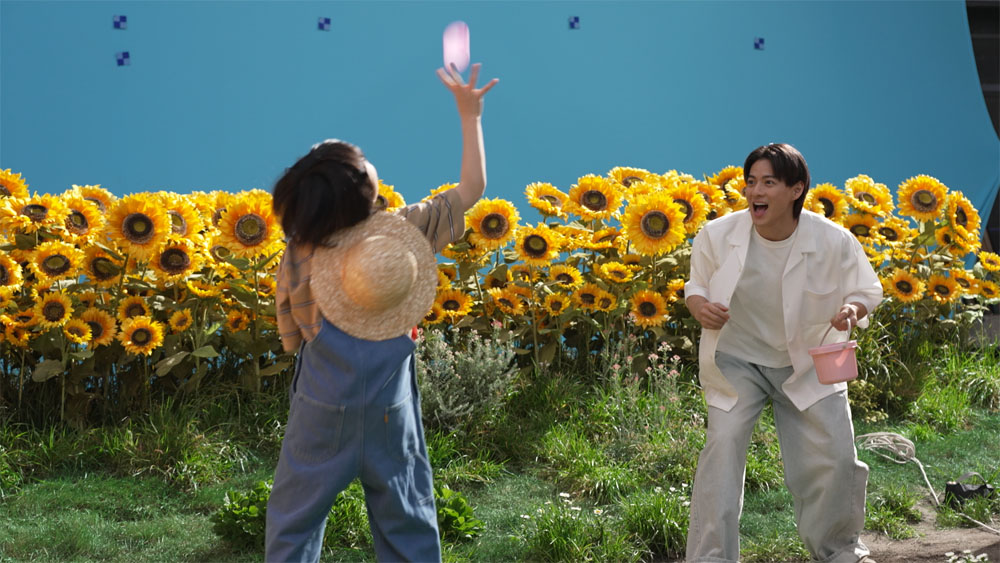 WEBムービーの撮影では3パターンを撮影。寝ている平野に少年がひまわりでいたずらして起こそうとするシーンや、互いをスケッチしようといろんなポージングをする中でわざと動いてちょっかいを出したり…。2人のほのぼのとしたかわいいやりとりは見どころいっぱい。
