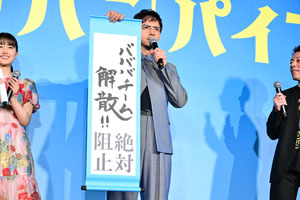 蘭丸が巻物を掲げながら「童貞喪失絶対阻止!」と高らかに叫ぶシーンにちなんで、「絶対阻止」したいものを巻物に書いて発表。早くも続編を期待する満島は「バババチーム解散!!絶対阻止」、早寝早起きを標榜する関口は「無駄な夜更かし絶対阻止!」とし「僕はイメージと違って朝型人間です。僕の夜更かしの時間は21:30以降。21時半に寝て朝5時半に起きたい」と明かした。
