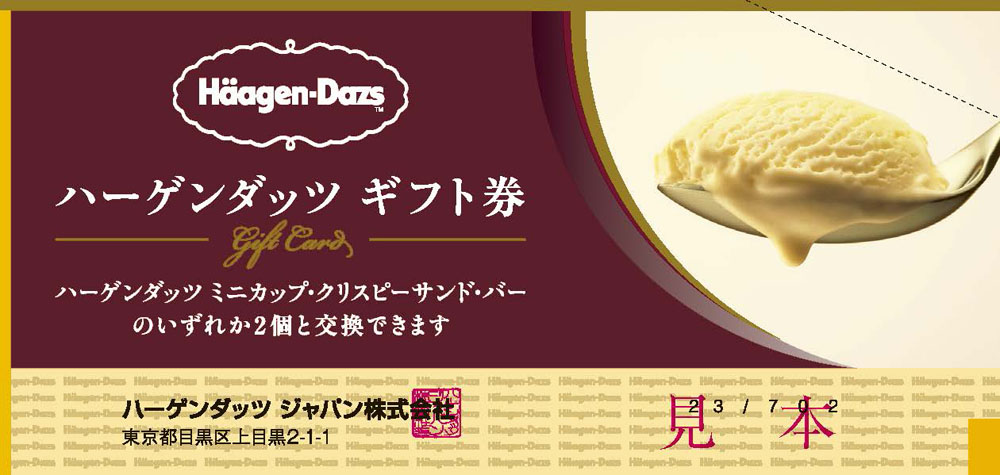 ギフト券1枚でハーゲンダッツミニカップ・クリスピーサンド・バーのいずれか2個と交換できる。