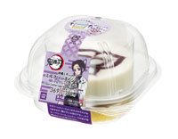 【内容】ブルーベリーソースで胡蝶しのぶのトレードマークの蝶をイメージしました。フィルムを外すとクリームがとろ~り流れ出す仕立てです。ふんわりシフォンの上に、生クリーム入りの濃厚なミルクソースをかけ、ブルーべリ―ソースで蝶を描きました。