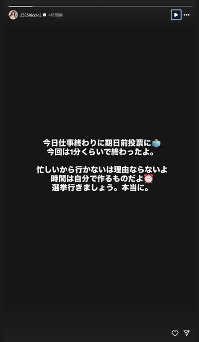 藤田ニコル、参議院選挙の期日前投票に行たことと「選挙行きましょう」と公式インスタのストーリーズで呼びかけ