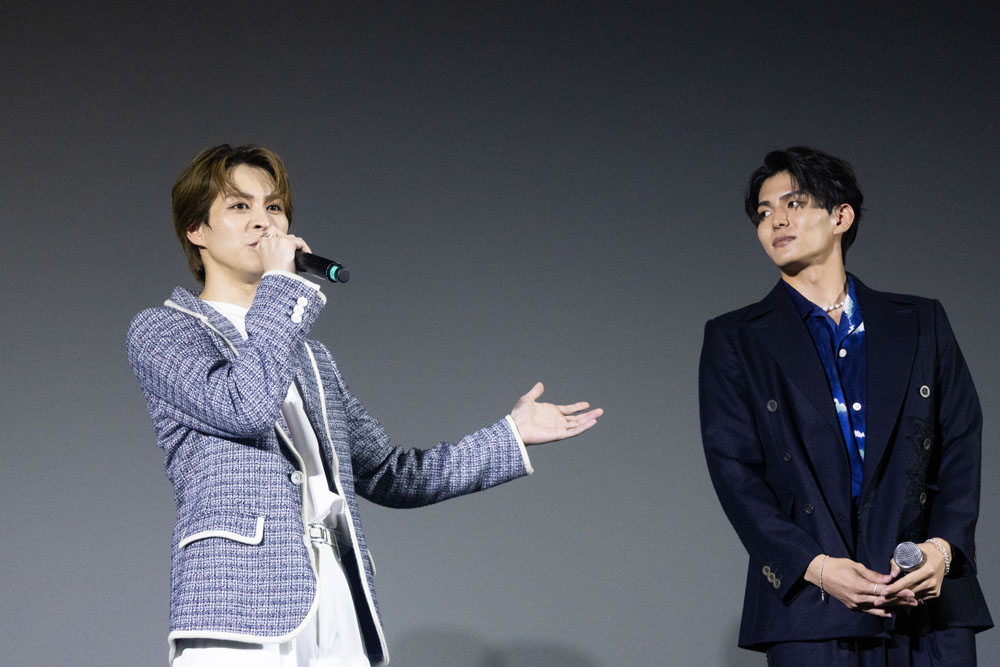 新島・式根島での撮影について、国上と西銘が劇中に登場する部屋で実際に2週間暮らしていたことが明かされると、会場からは驚きの声が。国上が「駿くんが夕飯を作ってくれたり、僕が朝ごはんを作ってあげたり。同棲じゃないですけど、そういう暮らしをしていました」と島での二人暮らしを振り返ると、西銘も「24時間つきっきりで二人でいたので、本当に仲良くなりました」としみじみ語った。