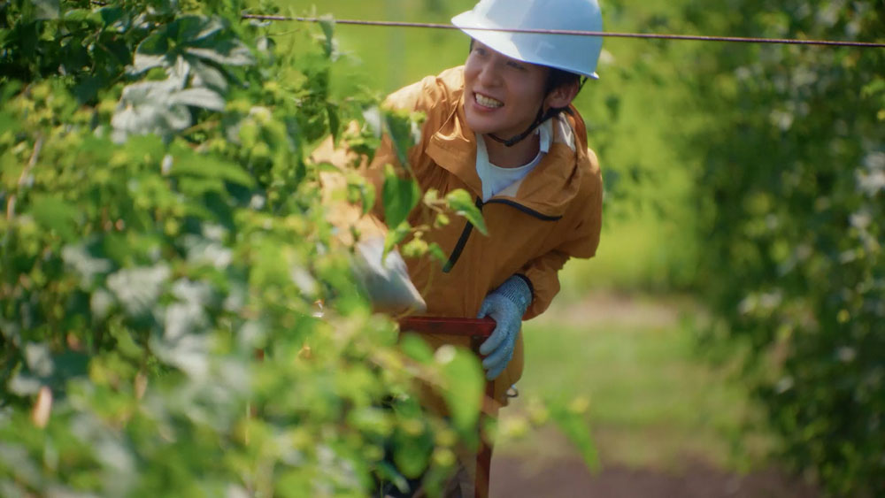 今回の新CM では、目黒蓮がホップ農家での収穫作業に初挑戦した。「晴れ風」 にも使用されている国産希少ホップ 「IBUKI」の採れたての爽やかな香りに、思わず「おおお!すごっ!」と声を漏らした目黒は、「これがまさに『晴れ風』 になっているんですね!」と驚きとともに、「晴れ風」 が生まれる原点に触れた。