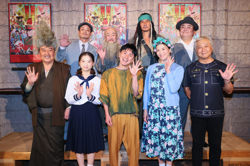 囲み取材に登壇した(後列左から)福田転球、温水洋一、伊原剛志、彦摩呂、(前列左から)風間杜夫、伊東蒼、安田章大、壮一帆、金守珍[撮影:宮川舞子]