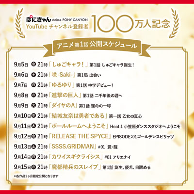 公開となるアニメは、『進撃の巨人』『SSSS.GRIDMAN』『ゆるゆり』『結城友奈は勇者である』『ダイヤのA』『咲-Saki-』『しゅごキャラ!』『魔都精兵のスレイブ』『カワイスギクライシス』『ボールルームへようこそ』『RELEASE THE SPYCE』の全11タイトル。9月5日より毎日1タイトルずつYouTubeプレミア公開され、各作品アーカイブは1ヶ月間となる。