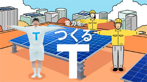その後のシーンでは、自宅の窓を二重窓に入れ替える様子とともに、堀越さんが「二重窓でH!」と消費電力を「へらす」アクションを紹介。続けて、ソーラーパネルを設置する業者の隣で長田さんが「太陽光でT!」、電気自動車を充電する人と一緒に松尾さんが「電気自動車でT!」と、電力を「つくる」「ためる」アクションを紹介。