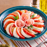 定番のカプレーゼにくるっと巻いた生ハムを添えて、まるでバラが咲いたようなひと皿に。