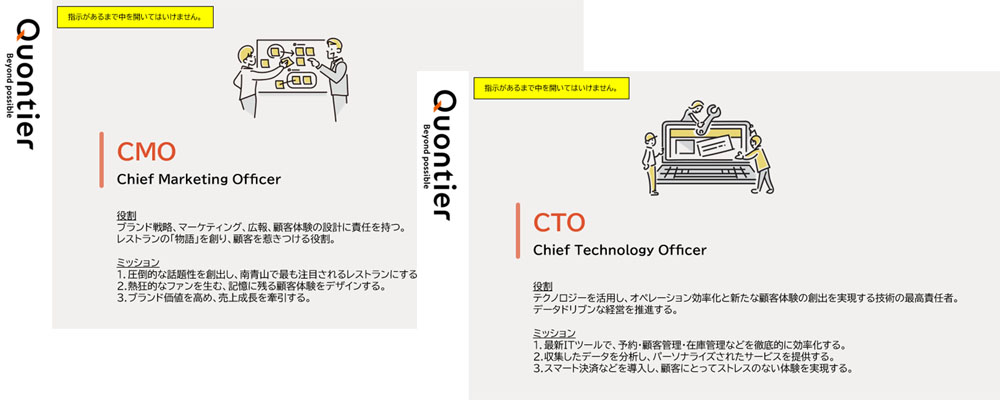 各CxO役には、表向きのミッションに加え、それぞれのバックグラウンドに基づいた「裏ミッション(隠された信念)」が設定されている。一見すると両立不可能な隠された信念をぶつけ合い、いかにしてチームとしての融合点を見つけ出せるか。リアルなビジネス同様の葛藤と交渉が求められる。
