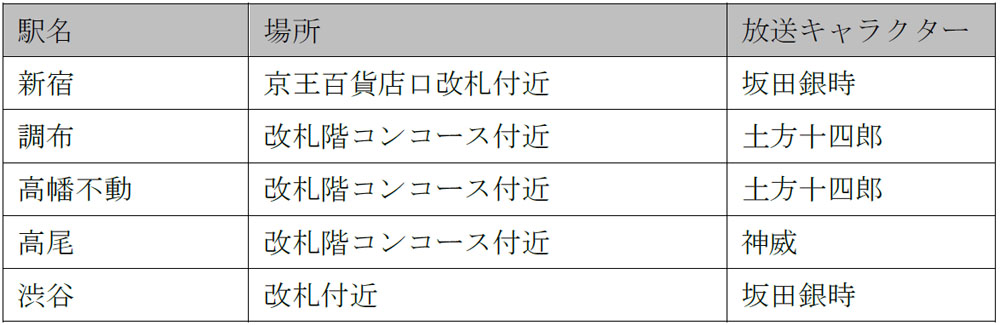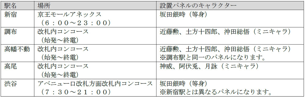 ※各駅の詳しい設置箇所や上記以外のキャラクターパネルの設置箇所は、特設サイト(https://gintama-buraritabi.jp)にて順次公開します。