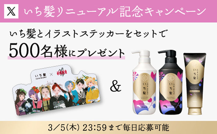 新CMの放映に合わせて、Xキャンペーンを実施いたします。いち髪X公式アカウント(@Kracie_ichikami)をフォローして、指定の投稿をリポストした方の中から抽選で、「いち髪 なめらかスムースケア」シャンプー・コンディショナー・トリートメントと人気イラストレーターtamimoonさんが描き下ろしたHANAメンバーの「イラストステッカー」がセットで500名様に当たります。