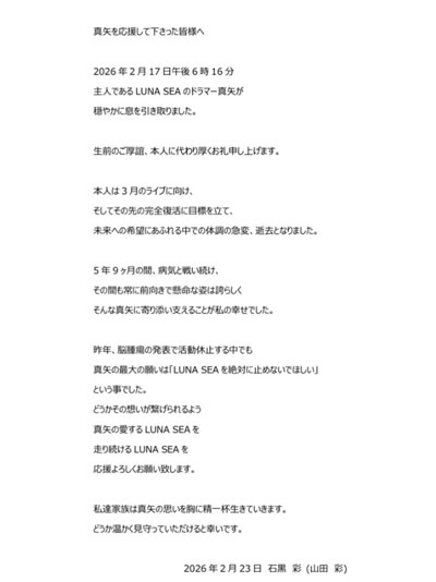 歌手でタレントの石黒彩が自身のInstagramで「真矢を応援して下さった皆様へ」と題し、夫でロックバンド『LUNA SEA』ドラマー真矢さんが2月17日に「穏やかに息を引き取りました 生前のご厚誼、本人に代わり厚くお礼申し上げます」と思いを投稿した。