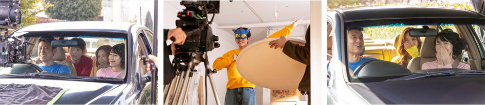 しんのすけの引越しシーンでは、しんのすけがアクション仮面のお面を被り、決めポーズをする場面も。高橋がかっこよくアクション仮面のポーズを決める姿は、シーズン1の第1話も思い出す。一方、しんのすけの帰りを待ちきれずに、家まで迎えに来た野原一家の車内シーンでは、本番以外の時間も近況報告で大盛り上がり。野原家らしい温かさとにぎやかさに包まれながら撮影は終了。