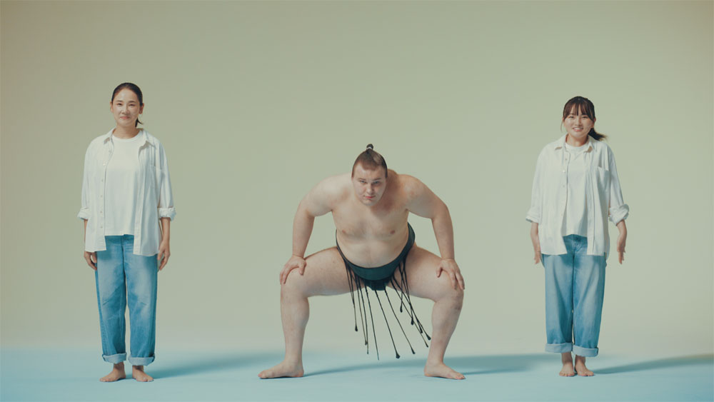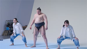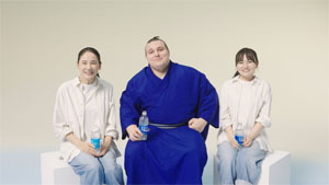 今回の撮影は終始和やかな雰囲気の中で行われた。中でも印象的だったのは、「ヒトの60%」篇で使用された水の入った巨大な撮影用小道具。体内の水分量を表現するために用意された数十キロにもなる容器を、安青錦関が軽々と持ち上げると、現場のスタッフから思わずどよめきが起こった。撮影後にはモニターを確認しながら監督と動作を細かくチェックするなど、真剣な表情で撮影に臨む姿も見られた。