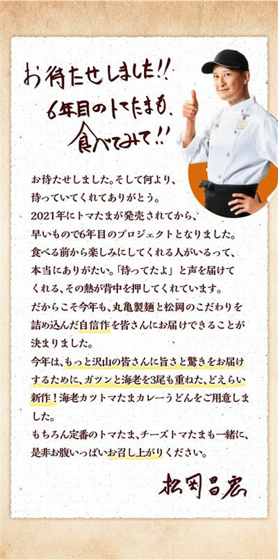 松岡昌宏、丸亀製麺と共同開発の「トマたまカレーうどんシリーズ」累計販売数1,200万食超え!最近「進化した」と感じることは…松岡昌宏、丸亀製麺と共同開発の「トマたまカレーうどんシリーズ」累計販売数1,200万食超え!最近「進化した」と感じることは…