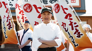 3月某日、春の訪れを感じる穏やかな日差しの中、丸亀製麺の実店舗にて『トマたまカレーうどん』の新テレビCM撮影が行われた。松岡の「おーい!」「帰ってきたぞー!」「今年もきたぞー!」という威勢の良い呼びかけシーン。丸亀製麺開発チームと同じコックコートに身を包んだ松岡の自信と高揚感あふれる表情が、印象的に映し出された。その後、舞台は厨房へ移り、『トマたまカレーうどん』の共同開発者としての顔をのぞかせるかのように、手際よく調理シーンの撮影が進んでいく。揚げたての海老カツをトングで掴む場面では、「どうよ!」と新作『海老カツトマたまカレーうどん』への確かな自信が感じられる表情を見せていた。