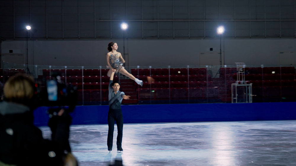 カメラが回る前には真剣な眼差しで演技や動き方の確認を重ね、いざ本番となると二人の息の合った迫力あるスケーティングの完成度の高さに、スタッフからは思わず拍手が起こる場面も。