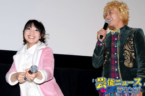 映画『海賊戦隊ゴーカイジャーVS宇宙刑事ギャバン THE MOVIE』初日舞台あいさつ ロープが重いことをアピールする小池に池田(右)ほほ笑む X Facebook Pocket LINE Pinterest コピー 2012.01.21