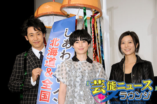 ヒットを祈願(左から大泉洋、原田知世、三島監督)